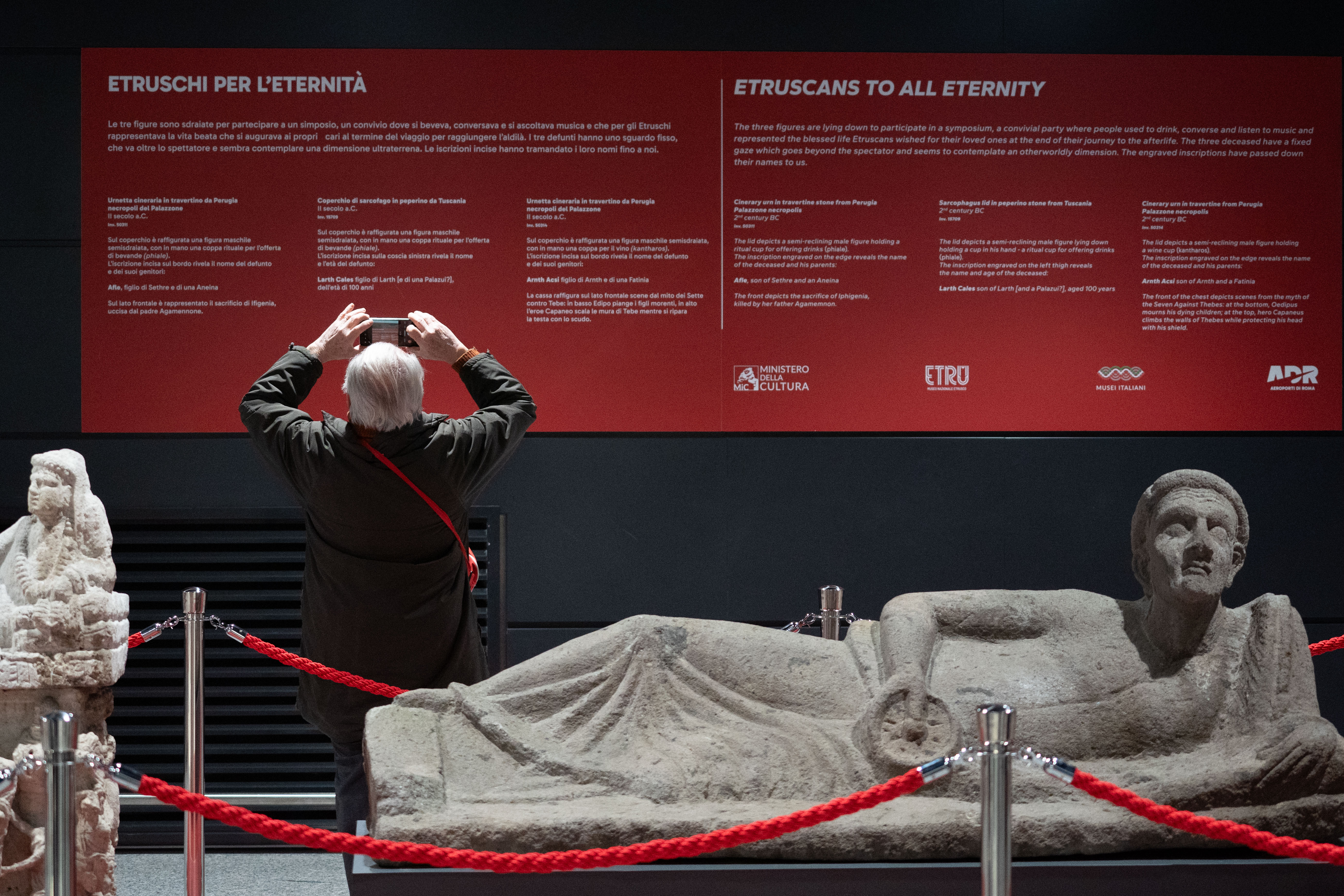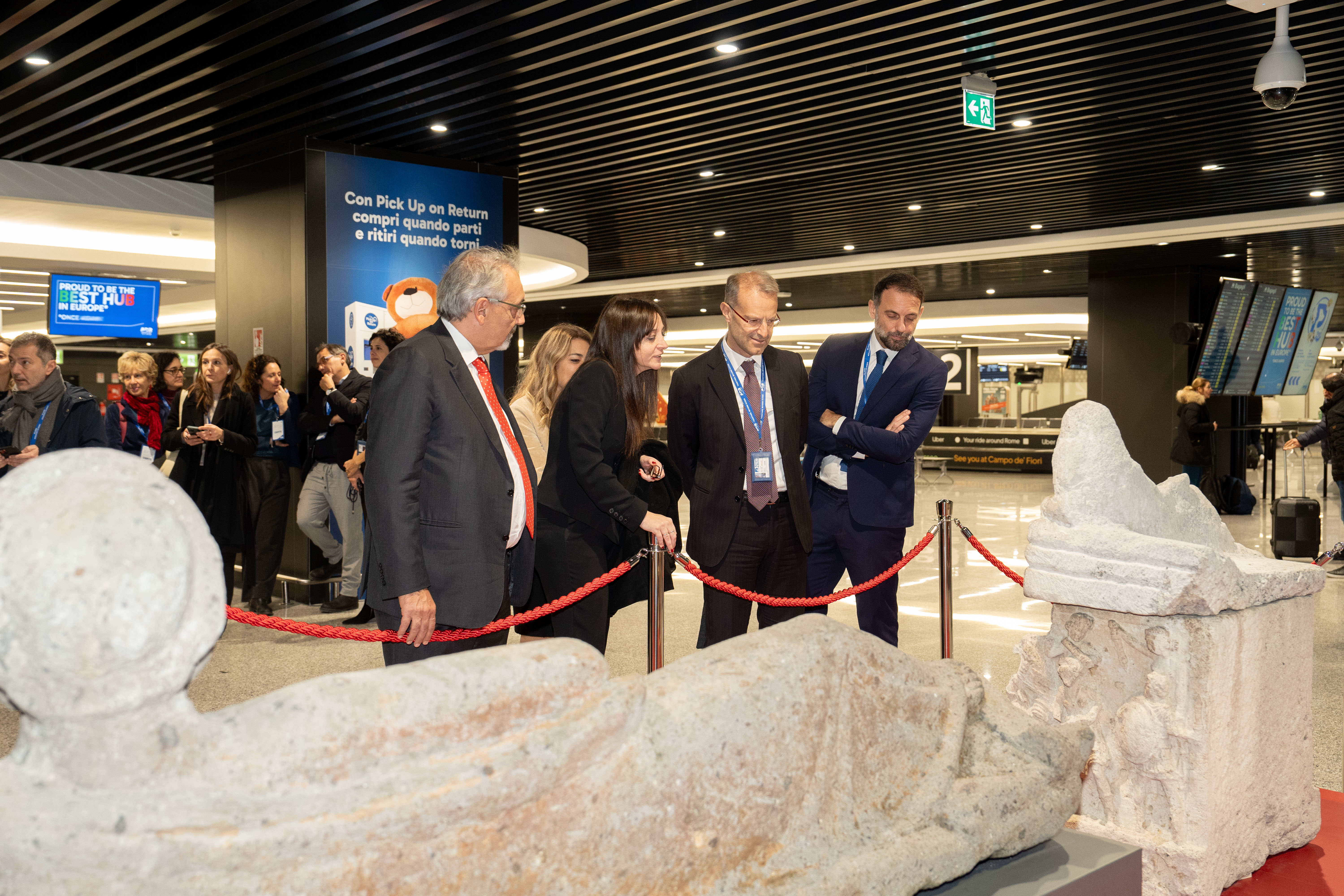 Ad "Etruschi per l’eternità", evento di presentazione delle tre opere che potranno essere ammirate, ogni giorno, da migliaia di passeggeri che transitano presso la zona Arrivi del Terminal 1, sono intervenuti Marco Troncone, Amministratore Delegato di Aeroporti di Roma; Luana Toniolo, Direttrice del Museo Nazionale Etrusco di Villa Giulia; Francesco Rocca, Presidente delle Regione Lazio, e Roberto Vannata, Direzione generale Musei MIC.