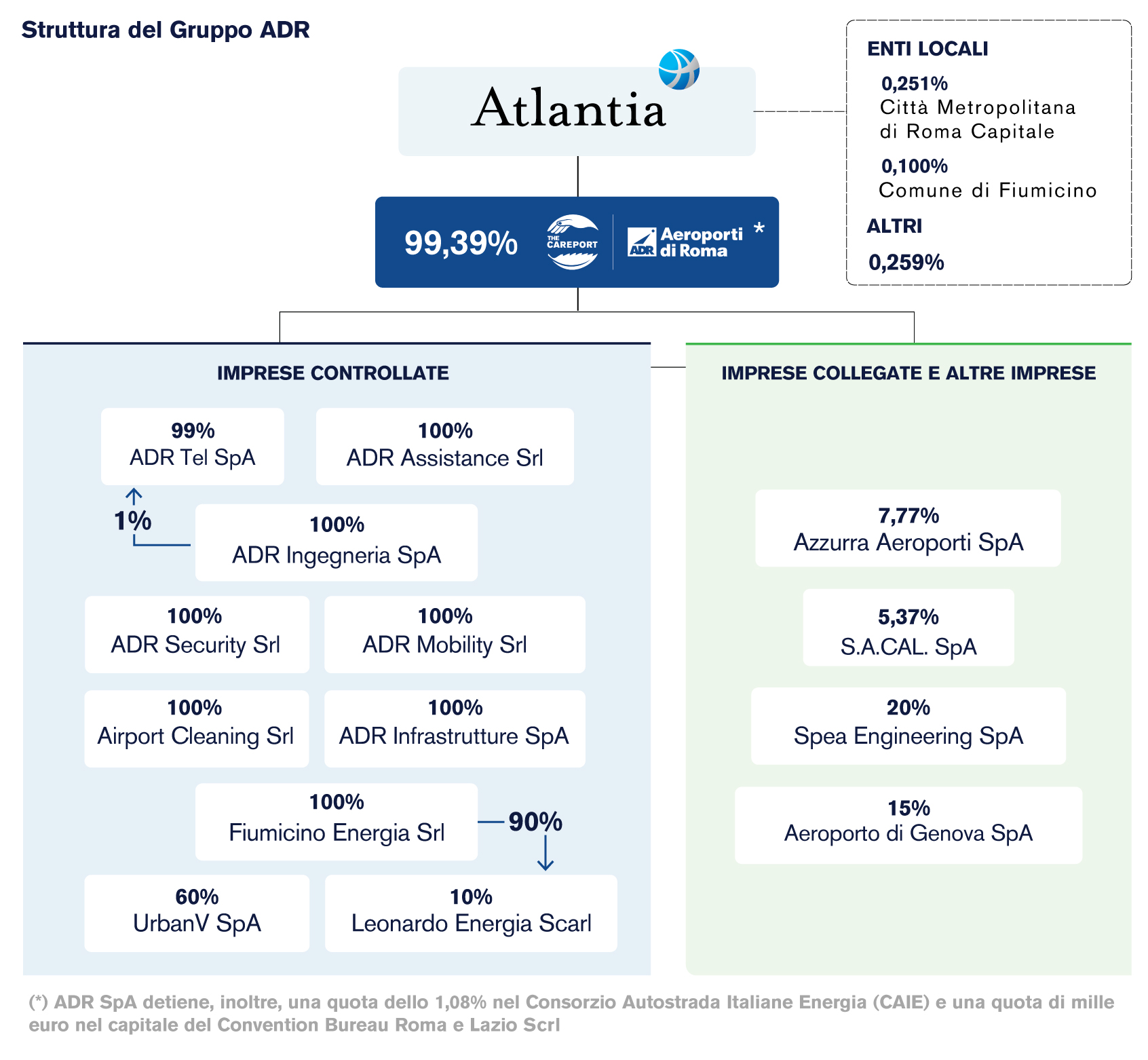 Il Gruppo ADR è attualmente composto dalle società controllate ADR Ingegneria S.p.A - Unipersonale; ADR Infrastrutture S.p.A. - Unipersonale; ADR Tel S.p.A.; ADR Assistance S.r.l. - Unipersonale, ADR Mobility S.r.l. - Unipersonale; ADR Security S.r.l. - Unipersonale; Airport Cleaning S.r.l. - Unipersonale; Leonardo Energia S.r.l.- Unipersonale; UrbanV S.p.A.; ADR Ventures S.r.l - Unipersonale che hanno consentito ulteriormente di valorizzare competenze e professionalità negli specifici settori, offrendo la propria conoscenza anche all'esterno.