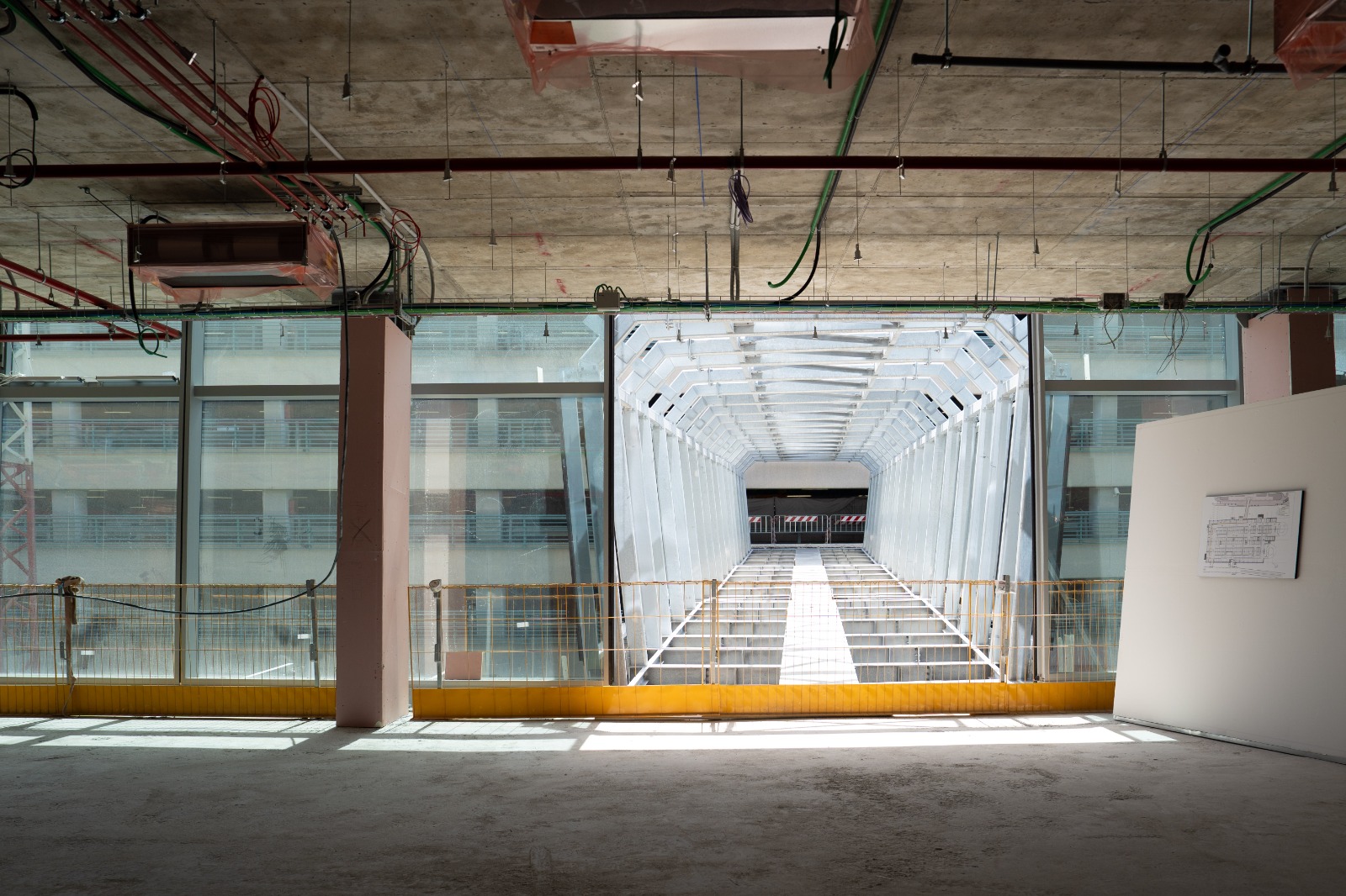 The building is located on a 5,224 sqm plot, developed over 5 above-ground floors and one underground technical level, with a maximum height of 21 m and a total gross floor area of 55,000 sqm. It is inserted within a highly accessible intermodal airport context, just a few meters from the multi-storey parking system, the railway station, and Terminal 1. Access to the building is provided via a drop-off area on the main façade and via the pedestrian bridge connecting it to Multi-storey Car Park A, which through elevated pedestrian walkways leads to the railway station and the Terminals.