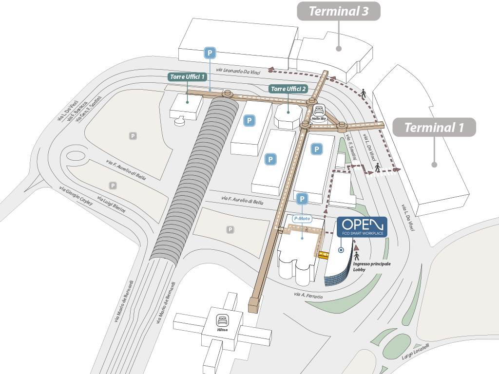 Open è strategicamente integrato all'interno del tessuto aeroportuale ed agevolmente connesso al sistema terminal e agli altri edifici direzionali land side. La prossimità con la stazione ferroviaria e con lo snodo autostradale, garantisce inoltre il collegamento verso la città ed altre destinazioni su territorio nazionale.
