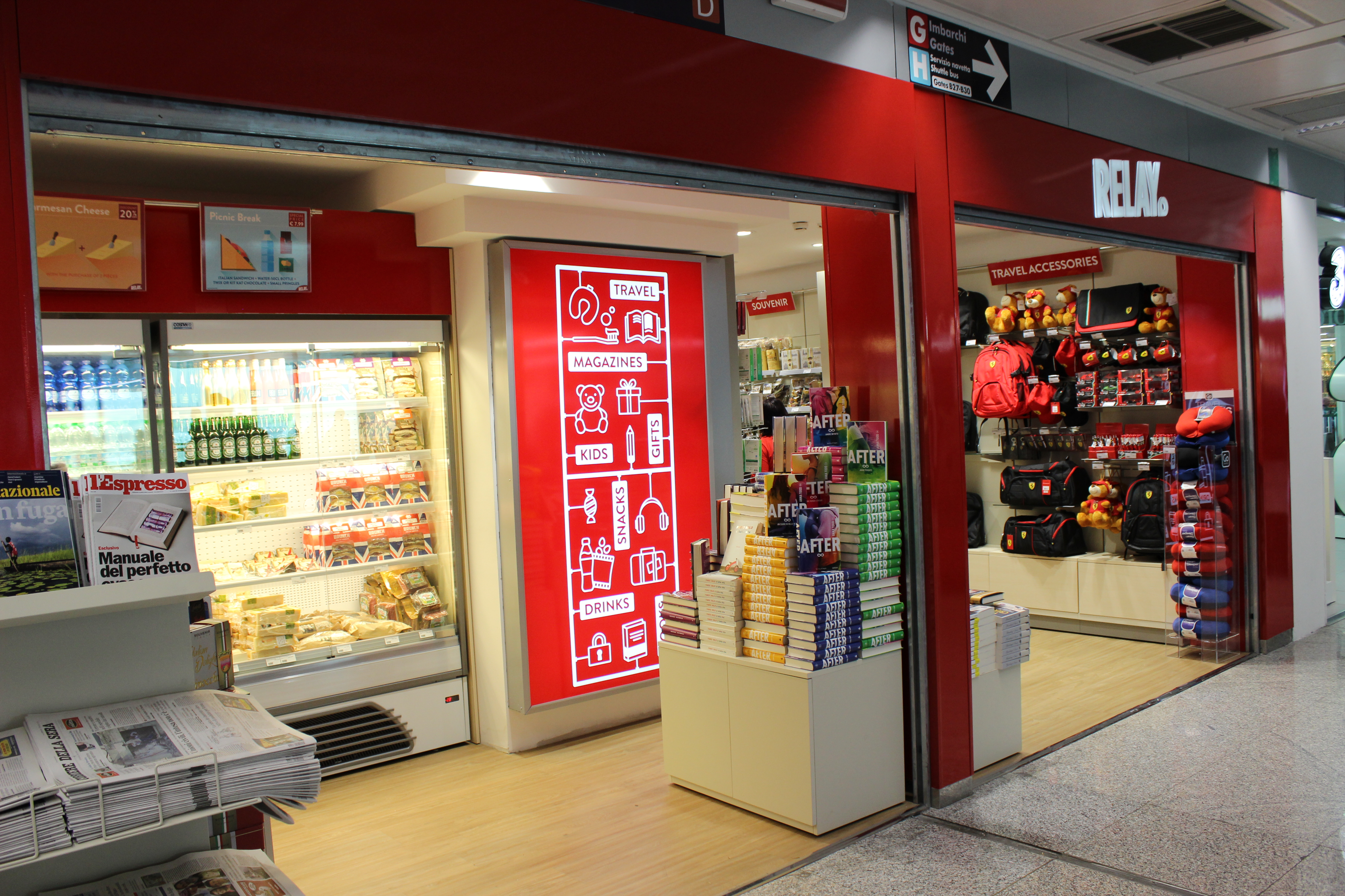 Non solo, Relay pensa anche a chi, per necessità, è alla continua ricerca di alimenti senza glutine confezionati. Possiede infine una molteplicità di accessori, articoli da viaggio, souvenir e, per i più piccoli, una vasta scelta di giocattoli.